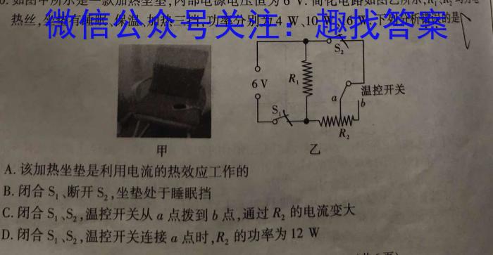 10.如图甲所示是一款加热坐垫,内部电源电压恒为6V.简化电路如图乙所示,R1、R2均为电热丝,坐垫有睡眠、保温、加热三挡,功率分别为4W、10W、16W.下列分析错误的;是乙A.该加热坐垫是利用电流的热效应工作的B.闭合S1、断开S2,坐垫处于C.闭合S1、S2,,温控开关从a点拨到b点,通过R2的电流变大D..闭合S1、S2,,温控开关连接a点时,R2的功率为12W