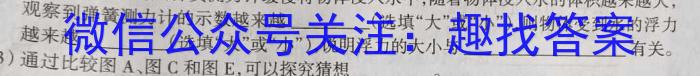 (2)如图B、C所示,用弹簧测力计缓慢将物体浸人水中,随着物体浸入水的体积越来越大,观察到弹簧测力计的示数越来越(选填“大”或“小”),则物体受到水的浮力越来越(选填“大”或“小”),说明浮力的大小与有关。