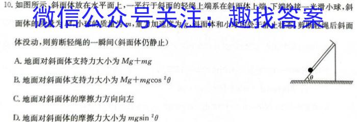 10.如图所示,斜面体放在水平面上,一平行于斜面的轻绳上端系在斜面体上端,下端拴接一光滑小球,斜面体的质量为M,小球的质量为m,,重力加速度为g,斜面体和小球均处于静止状态,剪断轻绳后斜面体没动,则剪断轻绳的一瞬间(斜面体仍静止)A.地面对斜面体支持力大小为Mg+mgB.地面对斜面体支持力大小为Mg+mg^2C.地面对斜面体的摩擦力方向向左D.地面对斜面体的摩擦力大小为mg^2