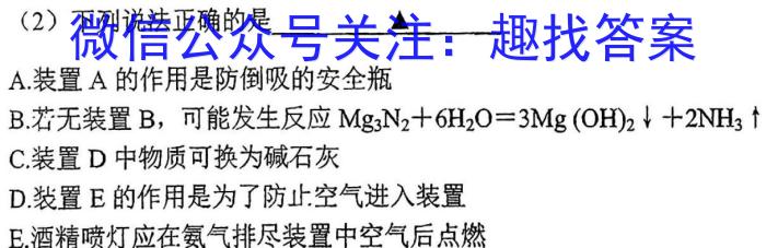 (2)下列说法正确的是▲A.装置A的作用是防倒吸的安全瓶B.若无装置B,可能发生反应Mg3N2+6H2OMMg(OH)2+2NH3C.装置D中物质可换为碱石灰D.装置E的作用是为了防止空气进入装置E.酒精喷灯应在氨气排尽装置中空气后点燃