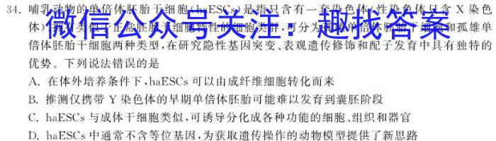 34.哺乳动物的单倍体胚胎干细胞(haESCs)是指只含有一套染色体(性染色体只含X染色体)、拥有类似于正常胚胎干细胞特性的细胞类群,可分为孤雌单倍体胚胎干细胞和孤雄单倍体胚胎干细胞两种类型,在研究隐性基因突变、表观遗传修饰和配子发育中具有独特的优势。下列说法错误的是A.在体外培养条件下,haESCs可以由成纤维细胞转化而来B.推测仅携带¥染色体的早期单倍体胚胎可能难以发育到囊胚阶段C.haESCs与成体干细胞类似,可诱导分化成各种功能的细胞、组织和器官D.haESCs中通常不含等位基因,为获取遗传操作的动物模型提供了新思路