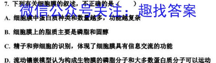 7.下列有关细胞膜的叙述,不正确的是()A.细胞膜中蛋白质种类和数量越多,功能越复杂B.细胞膜上的脂质主要是磷脂和固醇C.精子和卵细胞的识别,体现了细胞膜具有信息交流的功能D.流动镶嵌模型认为构成生物膜的磷脂分子和大多数蛋白质分子可以运动