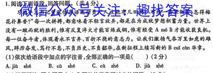 1.阅读下面语段,回答问题。(共4分)曾深情寄语运动员:“人生能有几回搏?不经一番寒彻骨,怎得梅花扑鼻香?”每一次拼搏,都意味着不轻言放弃,都是在为成就梦想积蓄力量。世界上没有一蹴而就的胜利,惟有反复淬火才能百炼成钢,惟有经受Am6lì才能收获良机。每一位奋斗者,体现着永不言弃、百折不挠的意志力。让我们激扬气吞万里如虎的雄风,蹲厉奋发、笃行不息,不负历史、不负韶华,在新征程上续写新的Bcuǐcàn华章。(1)依次给语段中加点的字注音,全部正确的一项是()(2分)A.jiùshěB.cùshěC.cùzheD.jiàzhē