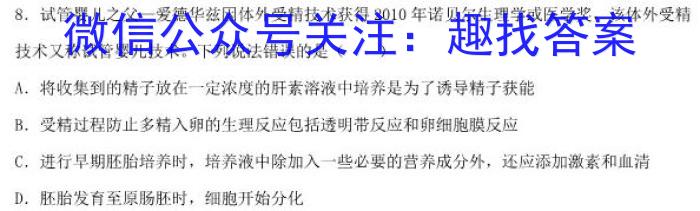 8.试管婴儿之父一爱德华兹因体外受精技术获得2010年诺贝尔生理学或医学奖,该体外受精技术又称试管婴儿技术。下列说法错误的是()A.将收集到的精子放在一定浓度的肝素溶液中培养是为了诱导精子获能B.受精过程防止多精入卵的生理反应包括透明带反应和卵细胞膜反应C.进行早期胚胎培养时,培养液中除加入一些必要的营养成分外,还应添加激素和血清D.胚胎发育至原肠胚时,细胞开始分化