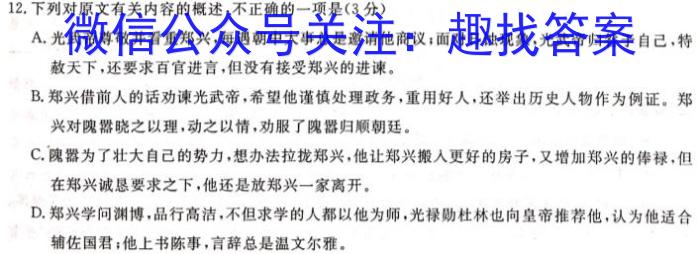 12.下列对原文有关内容的概述,不正确的一项是(3分)A.光武帝尊敬并看重郑兴,每遇朝中大事总是邀请他商议;面对日蚀现象,光武帝归咎于自己,特赦天下,还要求百官进言,但没有接受郑兴的进谏。B.郑兴借前人的话劝谏光武帝,希望他谨慎处理政务,重用好人,还举出历史人物作为例证。郑兴对隗嚣晓之以理,动之以情,劝服了隗嚣归顺朝廷。C.隗嚣为了壮大自己的势力,想办法拉拢郑兴,他让郑兴搬入更好的房子,又增加郑兴的俸禄,但在郑兴诚恳要求之下,他还是放郑兴一家离开。D.郑兴学问渊博,品行高洁,不但求学的人都以他为师,光禄勋杜林也向皇帝推荐他,认为他适合辅佐国君;他上书陈事,言辞总是温文尔雅。