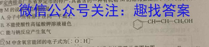 12.罗定肉桂是广东省罗定市的特产,其富含的一种有机物M的结构如图所示,下列有关有机物M的说法中正确的是A.分子中所有原子在同一平面上B.不能使酸性高锰酸钾溶液褪色CHCH-CH2OHC.能与钠反应产生氢气D.M中含氧官能团的电子式为[:O:H]^-