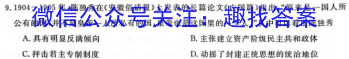 9.1904-1905年,陈独秀在《安徽俗话报》上发表的长篇论文《亡国篇》指出:“原来是一国人所公有的国,并不是皇帝一人所私有的国,皇帝也是这国里的一个人。”从中可以看出陈独秀A.具有明显反满倾向B.主张建立资产阶级民主共和政体C.抨击制度D.动摇了封建正统思想的统治地位