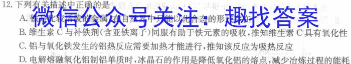 12.下列有关描述中正确的是A.铁是比较活泼的金属,在自然界中只能以化合态的形式存在B.维生素C与补铁剂(含亚铁离子)同服有助于铁元素的吸收,推知维生素C具有氧化性C.铝与氧化铁发生的铝热反应需要加热才能进行,推知该反应为吸热反应D.电解熔融氧化铝制铝单质时,冰晶石的作用是降低氧化铝的熔点,减少冶炼过程的能耗