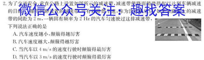 2.为了交通安全,常在公路上设置如图所示的减速带,减速带使路面稍微拱起以达到车辆减速的目的.一排等间距设置的减速带,可有效降低车速,称为洗衣板效应.如果某路面上的减速带的间距为2m,一辆固有频率为2Hz的汽车匀速驶过这排减速带,下列说法正确的是A.汽车速度越小,颠簸得越厉害B.汽车速度越大,颠簸得越厉害C.当汽车以4m/s的速度行驶时颠簸得最厉害D.当汽车以3m/s的速度行驶时颠簸得最厉害