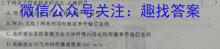 1.下列关于信息技术的说法,正确的是()A.用手机通话时,手机直接传输声音信号B.WiFi无线上网是利用电磁波来传输信息的C.光纤通信是依靠激光在光导纤维内沿直线传播来传递信息的D.电磁波在空气中的传播速度是340m/s