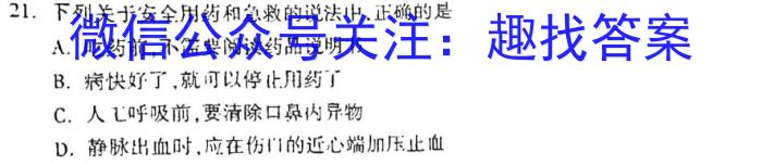 21.下列关于安全用药和急救的说法中,正确的是A.吃药前,不需要阅读药品说明书B.病快好了,就可以停止用药了C.人呼吸前,要清除口鼻内异物D.静脉出血时,应在伤的近心端加压止血