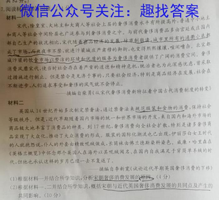 17.,阅读材料,回答问题、(14分)材料一宋代,除皇宝、大地主和大商人等社会上层的奢侈消费水平有所提高外,普通中小地主和商人等社会中间阶层也广泛参与到奢侈消费之中。与前代奢侈消費品多由宫廷或庄园内e部自己生产的状况相比,宋代随着有品冰的发展,市制,市里所有的通看小基都市场,而扎夜市不禁,就连梁城庄严肃穆的御街,也交得熙熙攘,喧闹嘴杂,北宋都城汁架的饮食市以整洁的环优质的服务为奢侈消费者提供了广间的消费空间,奢侈消费风宋代,使当时社会存在着严重的道德和精神危机,治者也为此深感忧虑,曾采取过措施进行制止,但是禁令是无济于事的,只要社会经济,特别是商品经济在发展,社会在不断进步,人们追求享受和奢侈的风气就不会停止。摘编自柒勇《从宋代奢侈消费新特征看中国古代消费制度的转交材料二英国从14世纪开始多次制定禁奢法,通过禁奢法来规范服装和食物的消费,保持社会等级秩序,但是,近代早期随着国内市场的统一和世界市场的开发,来自国内和海外市场的商品极大地丰富了消费品的种类。到17世纪,奢侈消费向全社会扩散,特别是诸多奢侈商品实现了大众化,推动了大众消费的形成,服装的国际化潮流也已出现,伊丽莎白女王时代的人就抱说,仆人的外套由精致呢绒做成,长简袜山佛兰德斯染料染色,威廉·哈里森在《英格兰概览》中怀念那个英国人在海外以其呢绒闻名、在国内自我满足于穿简单羊绒的时代,但他也承认这样的岁月已经一去不复返了,—摘编自李新宽《试论近代早期英国奢侈消费的下移)(1)根据材料一并结合所学知识,分析宋朝奢侈消费发展的原因(4分)(2)根据材料一、二并结合所学知识,概括宋朝与近代英国奢侈消费发展的共同点及产生的共同影响。(10分)
