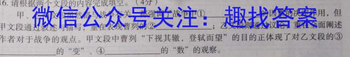 16.请根据两个文段的内容完成填空。(4分)甲、乙两文段虽然都与战争有关,都强调了战争中①的因素的决定作用,但甲文段通过叙述与描写,重在表现曹刿的②;乙文段则通过议论,重在全面阐述作者对于战争的观点。甲文段中曹刿“下视其辙,登轼而望”的目的正体现了对乙文段的③的“变”、④的“数”的观察。