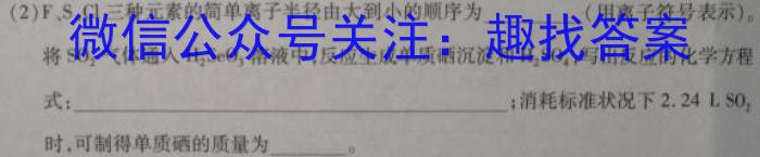 (2)F、S、Cl三种元素的简单离子半径由大到小的顺序为(用离子符号表示)。将SO2气体通入H2SeO3溶液中,反应生成单质硒沉淀和H2SO4,,写出反应的化学方程式:;消耗标准状况下2.24LSO2时,可制得单质硒的质量为。