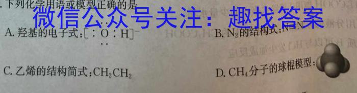 4.下列化学用语或模型正确的是B.N的结构式:N≡NA.羟基的电子式:[:0:H]^-B.N2N=NC.乙烯的结构简式:CH2CH2D.CH分子的球棍模型:D.CH4