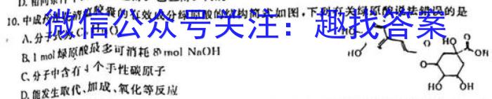 10.中成药连花清胶囊的有效成分绿原酸的结构简式如图,下列有关绿原酸说法错误的是C1H18O7A.分子式为C.Ha(),B.Imol绿酸多可消8molNnOHg)molNaOHC.分子中含有4个手性碳原子D.发生取代,加成、氧化等反应