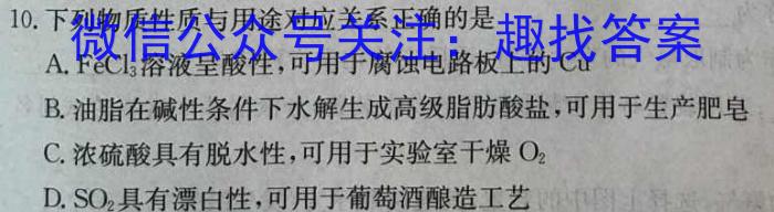 10.下列物质性质与用途对应关系正确的是A.FeCl3溶液呈酸性,可用于腐蚀电路板上的CuB.油脂在碱性条件下水解生成高级脂肪酸盐,可用于生产肥皂C.浓硫酸具有脱水性,可用于实验室干燥O2D.SO2具有漂白性,可用于葡萄酒酿造工艺
