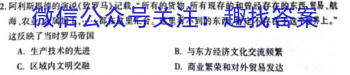 2.阿利斯提德的演说《致罗马》记载:“所有的货物,所有现存的和曾经存在的东西,贸易、航海、农业、金属加工,……都在这里汇合。这里看不到的东西,肯定不存在于这个世界上。”这反映了当时罗马帝国A.生产技术的先进B.与东方经济文化交流频繁C.区域内文明交融D.商业繁荣和对外贸易发达