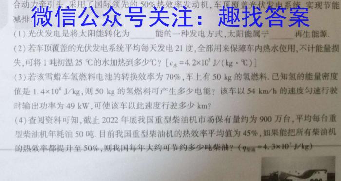 (1)光伏发电是将太阳能转化为能的一种发电方式,太阳能属于再生能源(2)若车顶覆盖的光伏发电系统平均每天发电21度,全部用来保障车内热水使用,不计能量损失,可将1吨初温25^C的水加热到多少^C?[c水=4.210^3J/(kg^C)](3)若该雪蜡车氢燃料电池的转换效率为70%,车上有50kg的氢燃料.已知氢的能量密度值是1.410^8J/kg,则50kg的氢燃料可产生多少电能?该车以54km/h的速度匀速行驶时输出功率为49kW,可使该车以此速度行驶多少km?(4)查阅资料可知,截止2022年底我国重型柴油机市场保有量约为900万台,平均每台重型柴油机年耗油50吨.目前我国重型柴油机的热效率平均值为45%,如果能把所有柴油机的热效率都提升至50%,则我国每年大约可节约多少吨柴油9.(g=4.310^7J/kg)