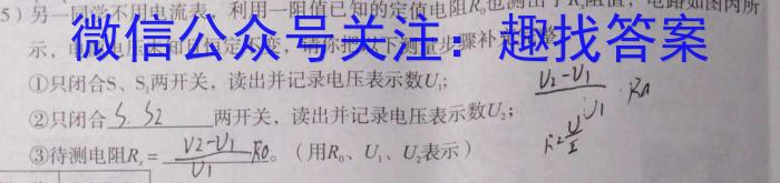 (5)另一同学不用电流表,利用一阻值已知的定值电阻R,也测出了R,阻值,电路如图两所R0示,电源电压未知且恒定不变,请你把以下测量步骤补充完整。S、S1①只闭合两开关,读出并记录电压表示数(U1;②只闭合3.32两开关,读出并记录电压表示数U;(U2;③待测电阻Rx=-11R0、U1、U2用R、U、U,表示)