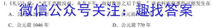 1.《礼记》载:“武王克殷反商,未及下车,而封黄帝之后于蓟。”该史料所载事件可能发生在A.公元前2070年B.公元前1600年C.公元前1046年D.公元前770年