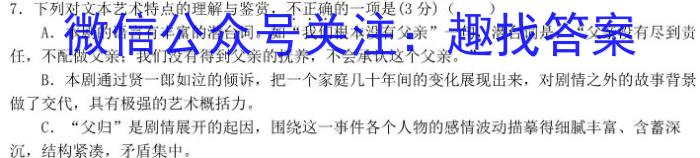 7.下列对文本艺术特点的理解与鉴赏,不正确的一项是(3分)()A.本剧的语言有丰富的潜台词。如“我们根本没有父亲”一句,潜台词是:“父亲没有尽到责任,不配做父亲;我们没有得到父亲的抚养,不会承认这个父亲。”B.本剧通过贤一郎如泣的倾诉,把一个家庭几十年间的变化展现出来,对剧情之外的故事背景做了交代,具有极强的艺术概括力。C.“父归”是剧情展开的起因,围绕这一事件各个人物的感情波动描摹得细腻丰富、含蓄深沉,结构紧凑,矛盾集中。