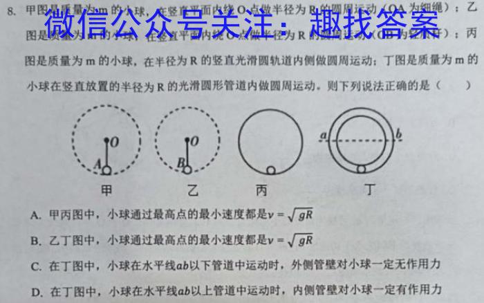 8.甲图是质量为m的小球,在竖直平面内绕O点做半径为R的圆周运动(OA为细绳);乙图是质量为m的小球,在竖直平面内绕O点做半径为R的圆周运动(OB为轻质杆);丙图是质量为nn的小球,在半径为R的竖直光滑圆轨道内侧做圆周运动:丁图是质量为小球在竖直放置的半径为R的光滑圆形管道内做圆周运动。则下列说法正确的是()A.甲丙图中,小球通过最高点的最小速度都是v=gRB.乙丁图中,小球通过最高点的最小速度都是v=gRC.在丁图中,小球在水平线ab以下管道中运动时,外侧管壁对小球一定无作用力D.在丁图中,小球在水平线ab以上管道中运动时,内侧管壁对小球一定有作用力