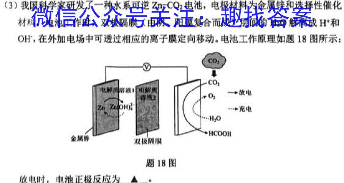 (3)我国科学家研发了一种水系可逆Zn-CO2电池,电极材料为金属锌和选择性催化材料。电池工作时,双极隔膜(由阴、阳膜复合而成)层间的H2O解离成H^+和OH^-,,在外加电场中可透过相应的离子膜定向移动。电池工作原理如题18图所示:题18图放电时,电池正极反应为▲