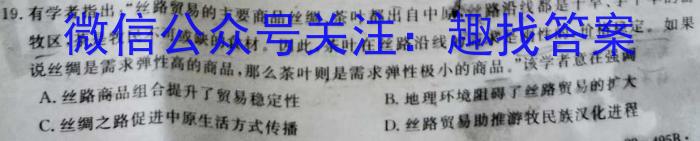 19.有学者指出:“丝路贸易的主要商品丝绸、茶叶都出自中原,路沿线都是干旱、半干旱的游牧区,茶是牧民不可或缺的食材。因此,茶叶在丝路沿线的需求是刚性的,价格稳定。如果说丝绸是需求弹性高的商品,那么茶叶则是需求弹性极小的商品。”该学者意在强调A.丝路商品组合提升了贸易稳定性B.地理环境阻碍了丝路贸易的扩大C.丝绸之路促进中原生活方式传播D.丝路贸易助推游牧民族汉化进程