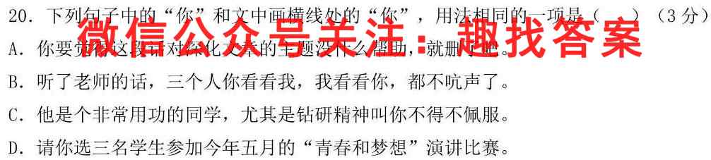 20.下列句子中的“你”和文中画横线处的“你”,用法相同的一项是()(3分)A.你要觉得这段话对深化文章的主题没什么帮助,就删了吧。B.听了老师的话,三个人你看看我,我看看你,都不吭声了。C.他是个非常用功的同学,尤其是钻研精神叫你不得不佩服。D.请你选三名学生参加今年五月的“青春和梦想”演讲比赛。