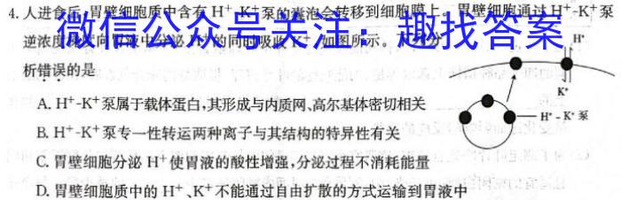 4.人进食后,胃壁细胞质中含有H^+-K^+泵的囊泡会转移到细胞膜上。胃壁细胞通过H^+-K泵泵逆浓度梯度向胃液中分泌H^+的同时吸收K^+,,如图所示。下列分析错误的是H^+KA.H^+-K^+泵属于载体蛋白,其形成与内质网、高尔基体密切相关B.H^+-K^+泵专一性转运两种离子与其结构的特异性有关C.胃壁细胞分泌H^+使胃液的酸性增强,分泌过程不消耗能量D.胃壁细胞质中的H^+、K^+不能通过自由扩散的方式运输到胃液中H^+-K^+泵