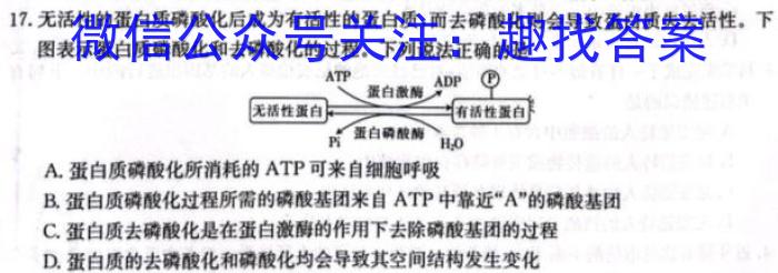 17.无活性的蛋白质磷酸化后成为有活性的蛋白质,而去磷酸化则会导致蛋白质失去活性。下图表示蛋白质磷酸化和去磷酸化的过程。下列说法正确的是A.蛋白质磷酸化所消耗的ATP可来自细胞呼吸B.蛋白质磷酸化过程所需的磷酸基团来自ATP中靠近““A”的磷酸基团C.蛋白质去磷酸化是在蛋白激酶的作用下去除磷酸基团的过程D.蛋白质的去磷酸化和磷酸化均会导致其空间结构发生变化