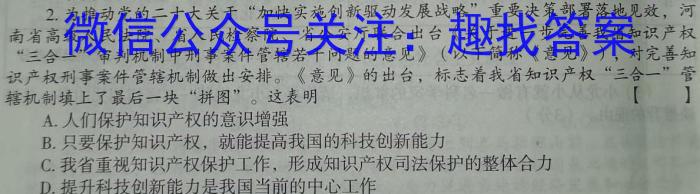 2.为推动关于“加快实施创新驱动发展战略”重要决策部署落地见效,河南省高级人民法院、省人民检察院、省公安厅联合出台《关于进一步完善我省知识产权“三合一”审判机制中刑事案件管辖若干问题的意见》(以下简称《意见》),对完善知识产权刑事案件管辖机制做出安排。《意见》的出台,标志着我省知识产权“三合一”管辖机制填上了最后一块“拼图”。这表明【】A.人们保护知识产权的意识增强B.只要保护知识产权,就能提高我国的科技创新能力C.我省重视知识产权保护工作,形成知识产权司法保护的整体合力D.提升科技创新能力是我国当前的中心工作