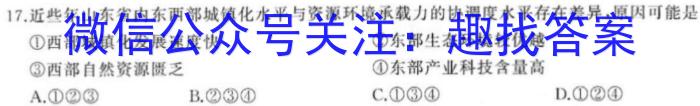 17.近些年山东省内东西部城镇化水平与资源环境承载力的协调度水平存在差异,原因可能是①西部城镇化发展速度快②东部生态环境较优越④东部产业科技含量高③西部自然资源匮乏A.①②③C.①③④D.①②④B.②③④