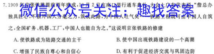 7.1909年京张铁路提前两年建成,10月2日在南口举行通车典礼,大会上广东代表说:“詹总办独具匠心,不假外国人分毫之力,筑成此路,为中国人吐气矣……铁路工程既可由中国人自筑之,全国矿务、机器、工厂,中国人也能自为之。”这说明京张铁路的修建A.使铁路成为陆路交通的主干B.使中国出现铁路建设的一个高潮C.增强了民族自尊心和自信心D.有利于促进经济交流与巩固边防