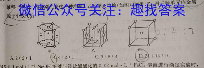 14.金属晶体中金属原子有三种常见的堆积方式:六方最密堆积、面心立方最密堆积和体心立方堆积。甲、乙、丙分别代表这三种堆积方式的单元结构(如图),则甲、乙、丙三种单元内金属4:2A.2:2:1B.3:2:10.02molL^-1FeCl3溶液进行滴定实验时,