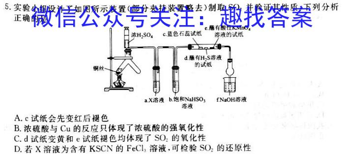5.实验小组设计了如图所示装置(部分夹持装置略去)制取SO2并验证其性质,下列分析正确的是A.c试纸会先变红后褪色B.浓硫酸与Cu的反应只体现了浓硫酸的强氧化性C.d试纸变黄和e试纸褪色均体现了SO2的氧化性D.若X溶液为含有KSCN的FeCl3溶液,可检验SO2的还原性