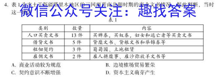 4.表1为出土于新疆塔里木地区的三国两晋南北朝时期的商业文书情况。据此判断,当时这一地区表1A.商业活动较为规范B.边境榷场贸易繁荣C.契约意识不断增强D.资本主义萌芽产生