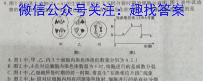 9.图1表示某个动物(2n=4)的生殖器官内处于不同分裂时期的细胞示意图,图2表中该动物的细胞在分裂过程中每条染色体上DNA含量的变化曲线图。下列相关叙述错误的是每条染色体上DNA含量丙时时期图1图2A.图1中,甲,乙、丙3个细胞内染色体组的数量分别为4.2,1B.图2中,d点对应细胞内染色体数量为时,细胞进行的是减数分裂C.图1中,乙细胞所处时期的前一时期,常发生”互换相应片段”现象D.图2中,be段对应细胞内均有同源染色体时,细胞进行的是有丝分裂