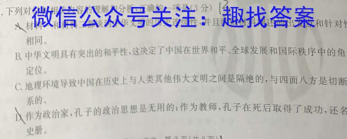 1.下列对材料相关内容的理解和分析,正确的一项是(3分BA材料一和材料二都谈到中华文明的历史连续性,并且两则材料阐述的出发点和针对相同。B.中华文明具有突出的和平性,这决定了中国在世界和平、全球发展和国际秩序中的角定位。C.地理环境导致中国在历史上与人类其他伟大文明之间是隔绝的,与四面八方是切断系的。D作为政治家,孔子的政治思想是无用的;作为教师,孔子在死后取得了成功,还名名史册。