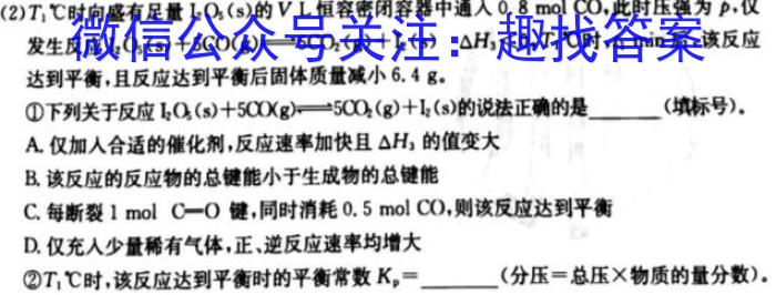 (2)T1^C时向盛有足量I2O5(s)的VL恒容密闭容器中通入0.8molCO,此时压强为p,,仅发生反应I2O5(s)+5CO(g)5CO2(g)+I2(s)H3<0,T1^C时,t1后,该反应达到平衡,且反应达到平衡后固体质量减小6.4g.①下列关于反应I2O5(s)+5OO(g)5OO2(g)+I2(s)的说法正确的是(填标号)。A.仅加人合适的催化剂,反应速率加快且H3的值变大B.该反应的反应物的总键能小于生成物的总键能C.每断裂1molC=0键,同时消耗0.5molCO,则该反应达到平衡D.仅充人少量稀有气体,正、逆反应速率均增大2T1^C时,该反应达到平衡时的平衡常数KP=(分压=总压X物质的量分数),