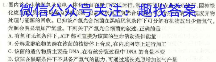 1.国内首个生物制氢及发电一体化项目在哈尔滨试运行,制氢环节以农业废弃秸秆、园林绿化废弃物、厨余垃圾等为发酵底物,以高效厌氧产氢光合细菌为氢气的生产者,实现废弃物处理与能源的回收。已知该产氢光合细菌在黑暗厌氧条件下可分解有机物放出少量氢气,光照会明显增加产氢量。下列关于产氢光合细菌的叙述,正确的是A.有氧和无氧条件下,,ATP都可直接为该菌的生命活动提供能量B.分解发酵底物的酶在该菌的核糖体上合成,在内质网等上进行加工C.该菌的遗传物质主要是DNA,,在有丝分裂过程中DNA的含量不变D.该菌在黑暗条件下不具备产氢气的能力,可通过延长光照增加氢气产量
