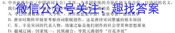 8.中央电视台的《中国诗词大会》节目,力求用传统的力量弘扬文化自信,以诗词的名义,践行青春誓言。下列关于唐诗宋词元曲的叙述正确的是A.李白杜甫被称为“大李杜”,其作品想象丰富,豪放夸张,感情真挚B.唐宋时期科举制要考察诗词歌赋创作,这是唐诗宋词繁盛的根本原因C.苏、辛是宋词的代表人物,靖康之耻是他们创作的社会背景和思想源泉D.疆域辽阔,国家统一,民族融合,导致元曲创作“百花齐放”