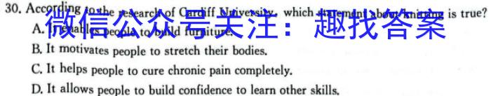 30.According to the research of Cardiff University, which statement about knitting is true?A.It enables people to build furniture.B.It motivates people to stretch their bodies.C.It helps people to cure chronic pain completely.D.It allows people to build confidence to learn other skills.