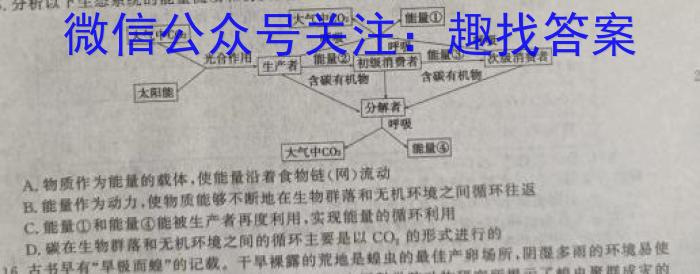 15.分析以下生态系统的能量流动和物质循环的关系简图,不能得到的结论是A.物质作为能量的载体,使能量沿着食物链(网)流动B.能量作为动力,使物质能够不断地在生物群落和无机环境之间循环往返C.能量①和能量④能被生产者再度利用,实现能量的循环利用D.碳在生物群落和无机环境之间的循环主要是以CO2的形式进行的主要是