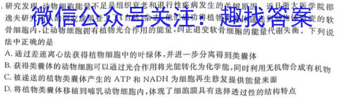 4.研究发现,动物细胞能量不足是组织衰老和退行性疾病发生的关键原因,近日浙大医学院邵逸夫研究团队的研究成果登上了《自然》杂志,他们成功将植物类囊体递送到动物体退变的软骨细胞内,让动物细胞拥有植物光合作用的能量,纠正退变软骨细胞的能量代谢失衡。下列说法中正确的是A.通过差速离心法获得植物细胞中的叶绿体,并进一步分离得到类囊体B.获得类囊体的动物细胞可以通过光合作用将光能转化为化学能,同时利用无机物合成有机物C.被递送的植物类囊体产生的ATP和NADH为细胞再生修复提供能量来源D.将植物类囊体移植到哺乳动物细胞内,体现了细胞膜具有选择透过性的结构特点