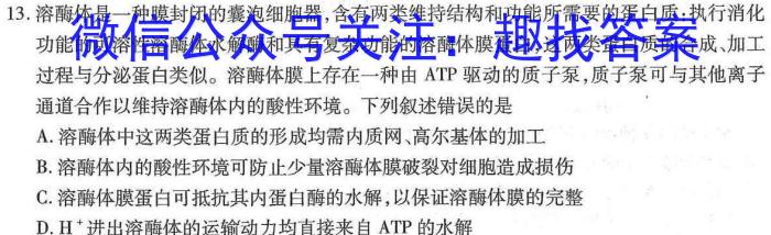 13.溶酶体是一种膜封闭的囊泡细胞器,含有两类维持结构和功能所需要的蛋白质:执行消化功能的可溶性溶酶体水解酶和具有复杂功能的溶酶体膜蛋白,这两类蛋白质的合成、加工过程与分泌蛋白类似。溶酶体膜上存在一种由ATP驱动的质子泵,质子泵可与其他离子通道合作以维持溶酶体内的酸性环境。下列叙述错误的是A.溶酶体中这两类蛋白质的形成均需内质网、高尔基体的加工B.溶酶体内的酸性环境可防止少量溶酶体膜破裂对细胞造成损伤C.溶酶体膜蛋白可抵抗其内蛋白酶的水解,以保证溶酶体膜的完整D.H*进出溶酶体的运输动力均直接来自ATP的水解