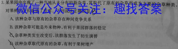 3.某果园中出现了一种当地从未分布的新杂草,其取代了原有的杂草而成为主要的杂草种米对果树的生长造成了危害。下列说法正确的是BA.该种杂草与原有的杂草存在种间竞争关系B.该种杂草可能是外来物种,有利于果园群落的稳定入杂草种类发生改变后,该群落发生了初生演替D.该种杂草取代原有的杂草,有利于果树增产