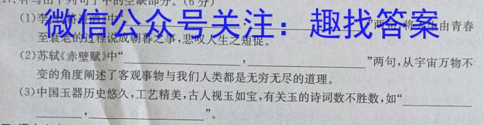 17.补写出下列句子中的空缺部分。(6分)(1)李白《将进酒》中“,”两句,将人生由青春至衰老的过程说成朝暮之事,悲叹人生之短促。(2)苏轼《赤壁赋》中“,”两句,从宇宙万物不变的角度阐述了客观事物与我们人类都是无穷无尽的道理。(3)中国玉器历史悠久,工艺精美,古人视玉如宝,有关玉的诗词数不胜数,如“,”