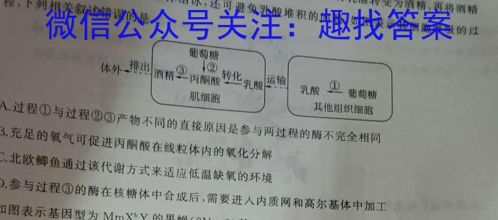 -80^C4.研究发现,酒精在一80℃条件下不会凝固。北欧鲫鱼在缺氧时将乳酸转变为酒精,再将酒精程,下列相关叙述错误的是经鱼排到水中,延缓周围水体结冰,还可避免乳酸堆积的问题,如图表示其细胞呼吸的过体外排出A.过程①与过程②③产物不同的直接原因是参与两过程的酶不完全相同B.充足的氧气可促进丙酮酸在线粒体内的氧化分解C.北欧鲫鱼通过该代谢方式来适应低温缺氧的环境D.参与过程③的酶在核糖体中合成后,需要进入内质网和高尔基体中加工